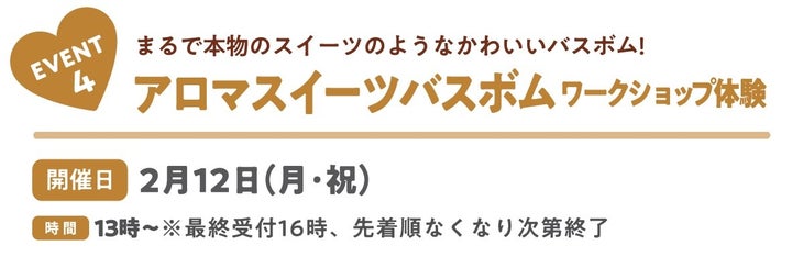 さらに、バレンタインにちなんだアロマスイーツバスボムのワークショップも開催されます。
