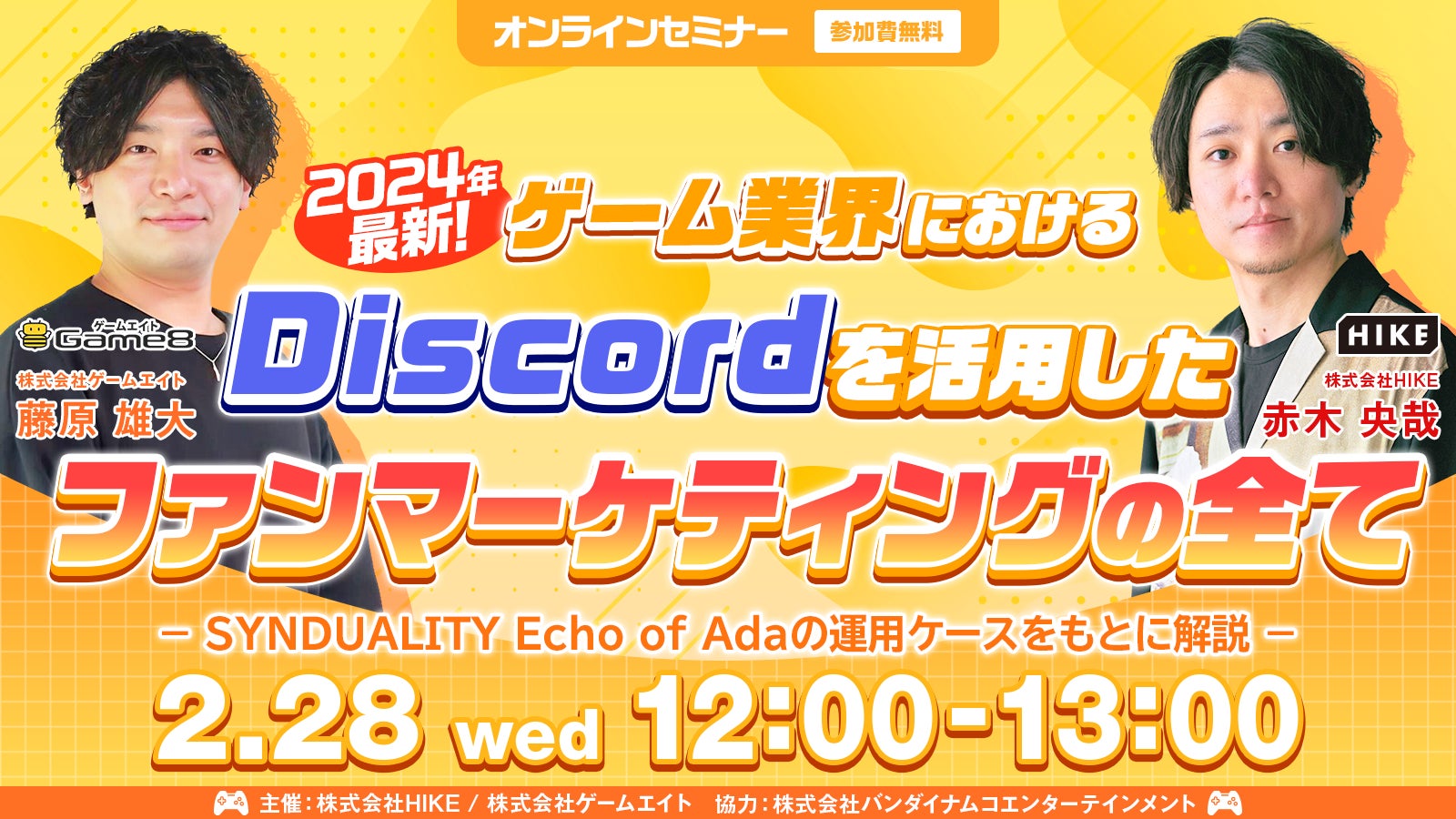 ゲームエイトとHIKEは、2月28日にオンラインセミナー「ゲーム業界におけるDiscordを活用したファンマーケティング」を開催します。