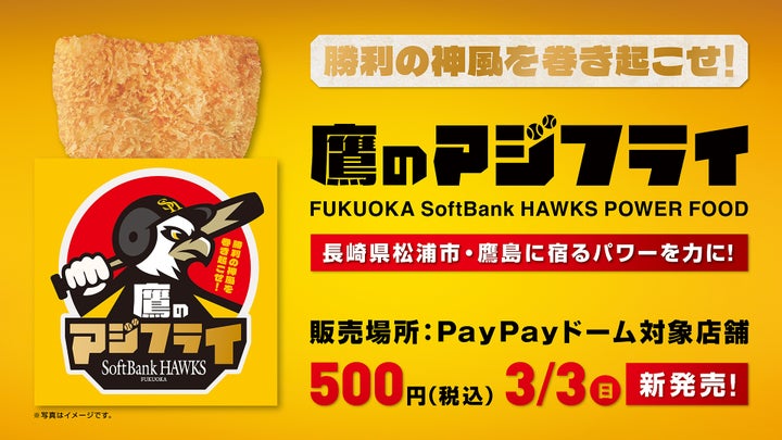 福岡ソフトバンクホークスと株式会社三陽、長崎県松浦市が協力し、福岡PayPayドームで「鷹のアジフライ」という新しいグルメを販売することを発表しました。