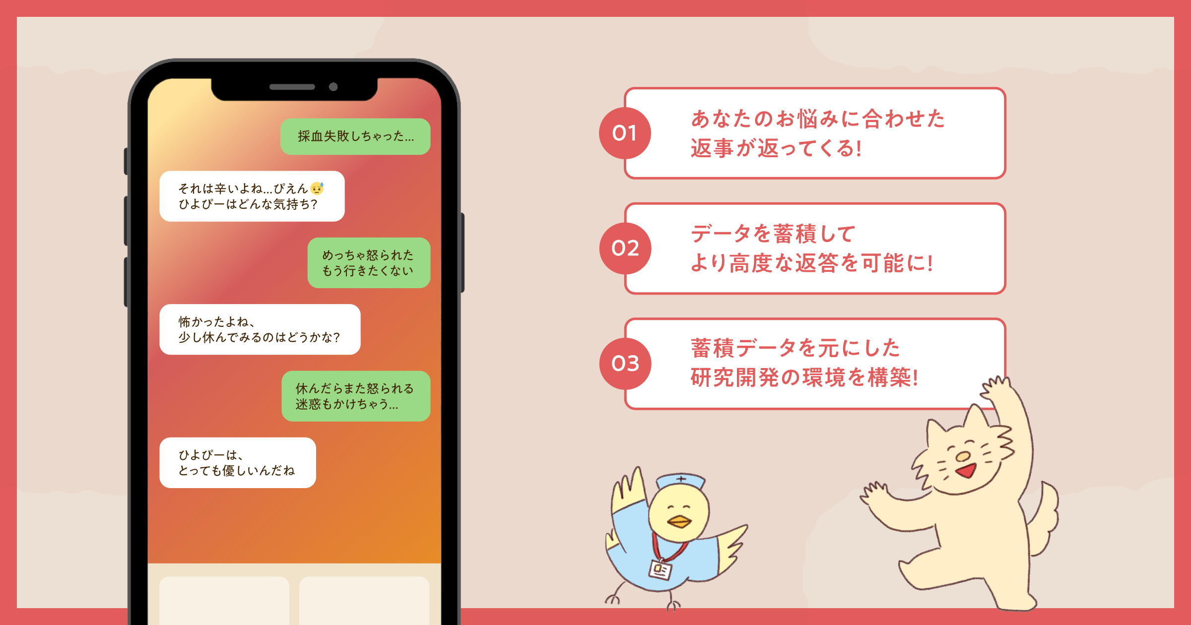 また、ChatGPTは安価で活用することができるため、カウンセラーという職業のサポートとして労働環境の改善などにも役立つ可能性があり、結果として世の中のメンタルの課題を解決することに一歩近づいたと考えています。ChatGPTを搭載した、新しい「ナースビー」にご期待ください。