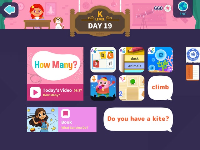 - アプリには26レベル、3,500のアクティビティ、500冊のデジタル絵本、700のデイリーコースがある