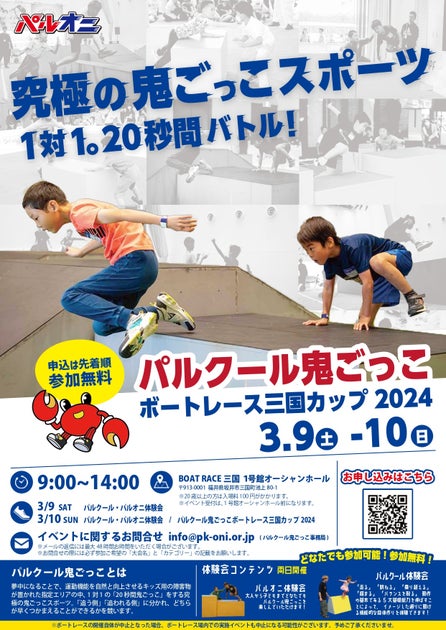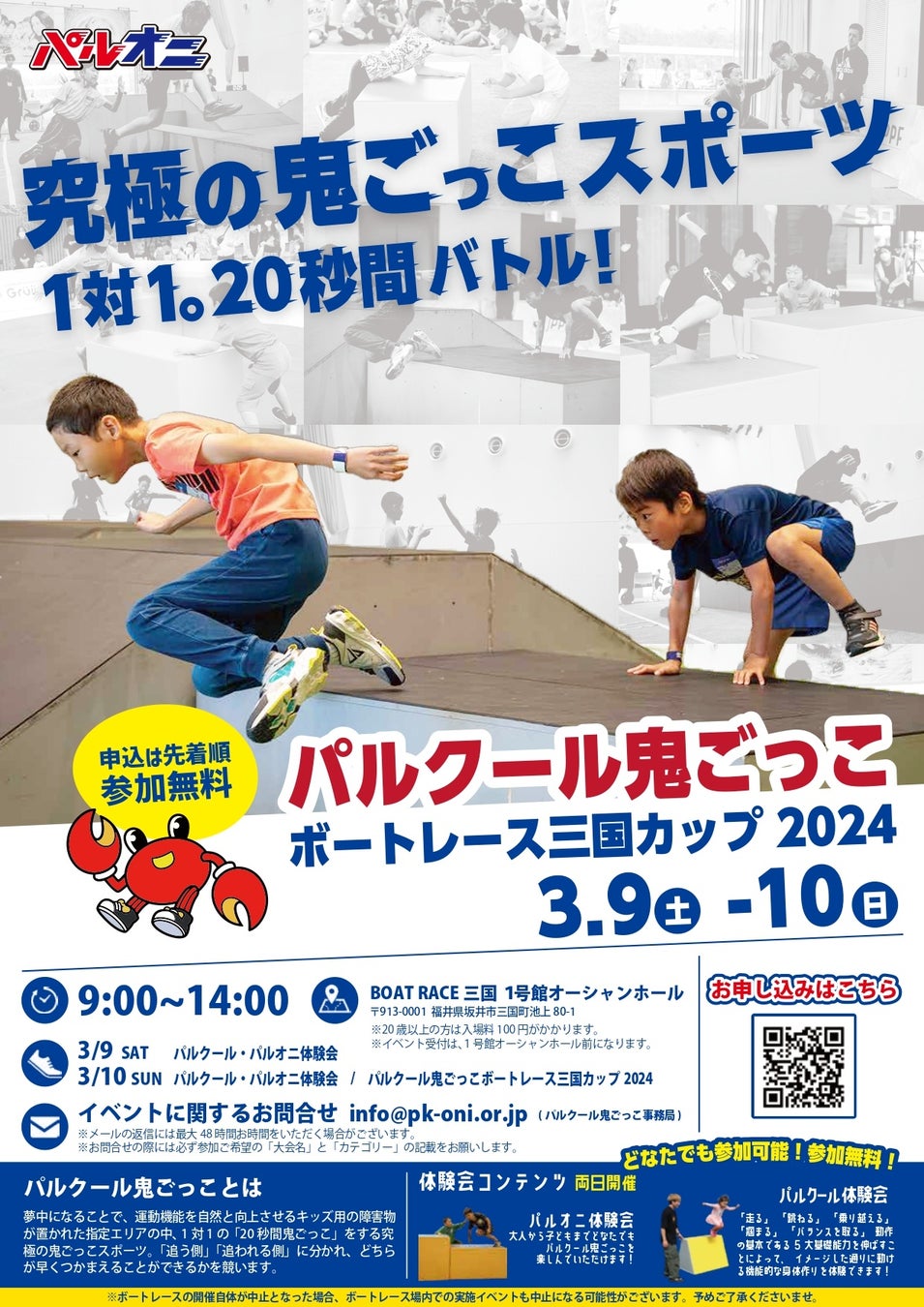 2024年3月9日(土)と10日(日)に、福井県坂井市で開催される「パルクール鬼ごっこボートレース三国カップ2024」は、小学生以下とその保護者を対象にした限定イベントです。