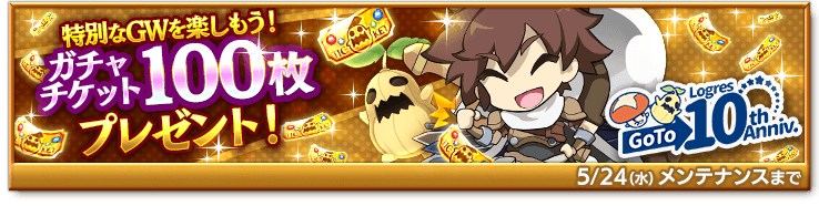 GWの特別プレゼントとして、ゴールデンガチャチケット100枚を期間中の初回ログイン時にお贈りします。