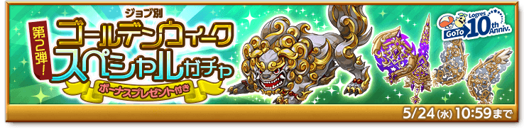 定番ガチャでは手に入らない期間限定武器と人気武器が確率アップした、GoTo10周年&ゴールデンウィーク記念の特別なガチャをお見逃しなく!