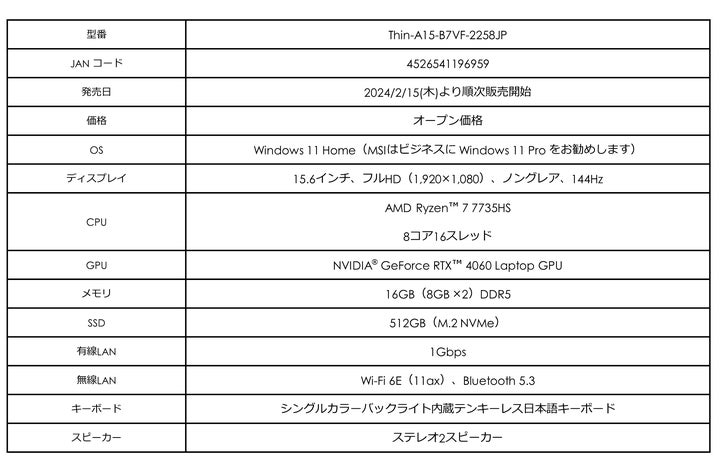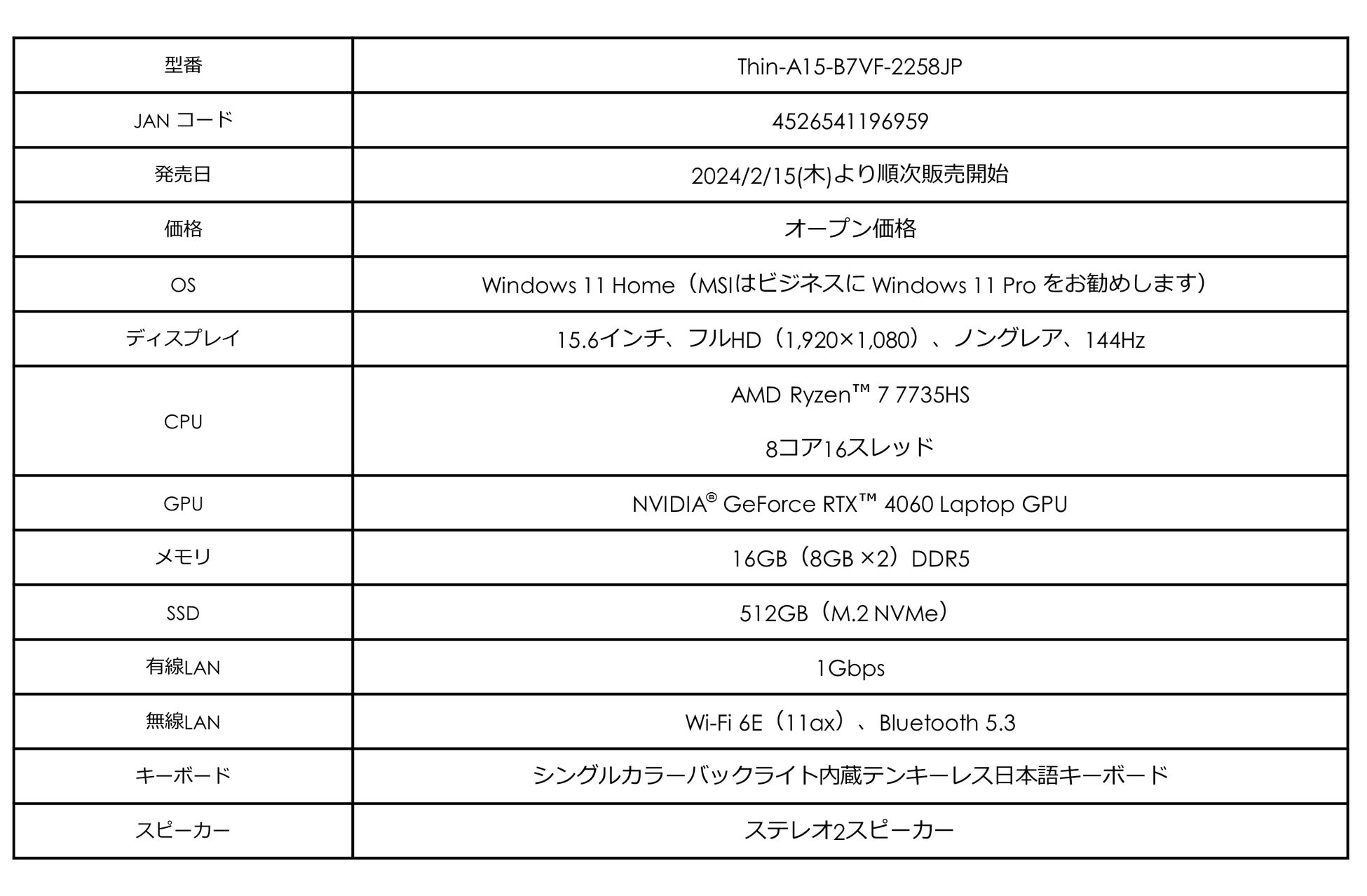 最後に、「Thin A15 B7V」は、人気の「Thin」シリーズにAMD Ryzen™ プロセッサーを搭載したモデルです。