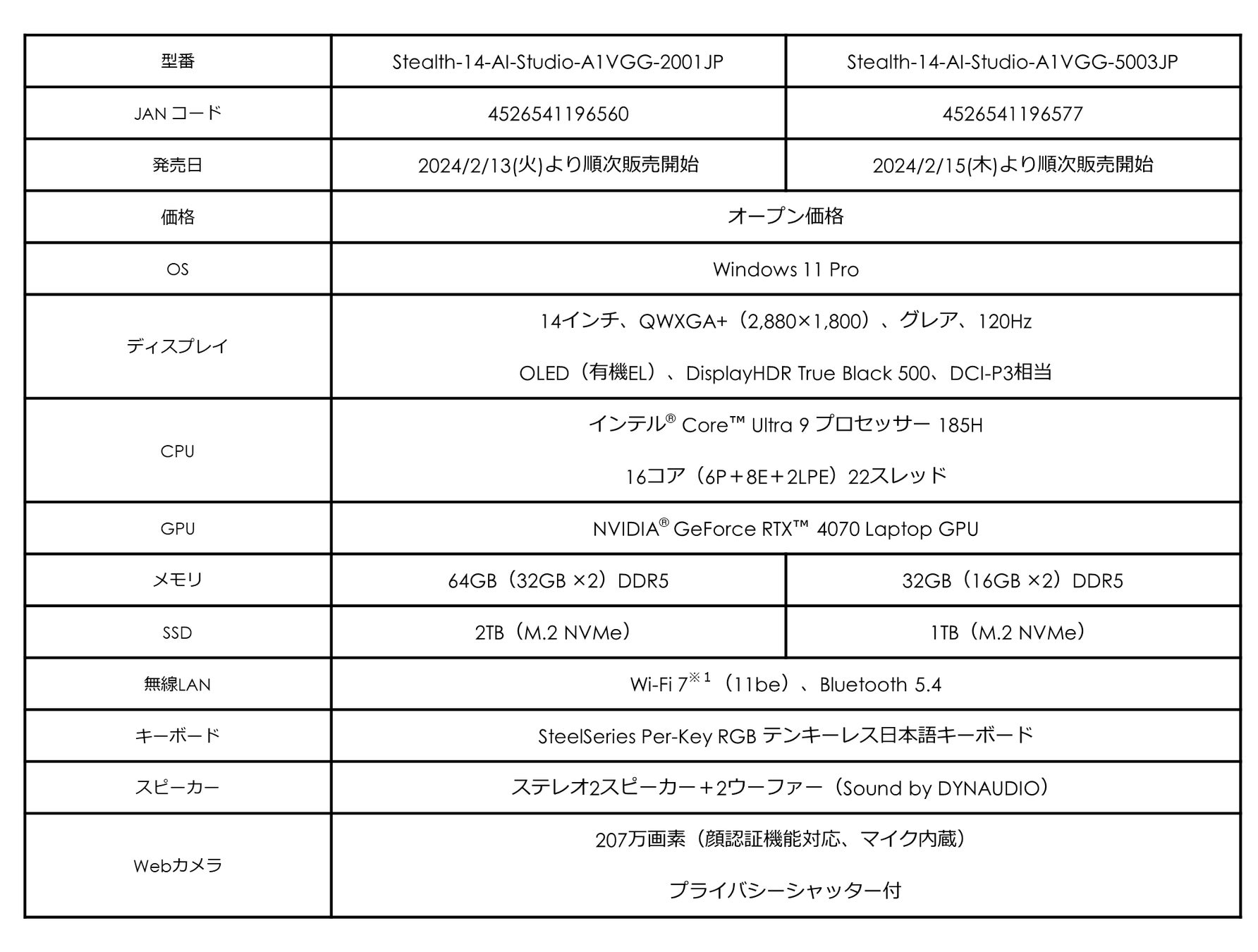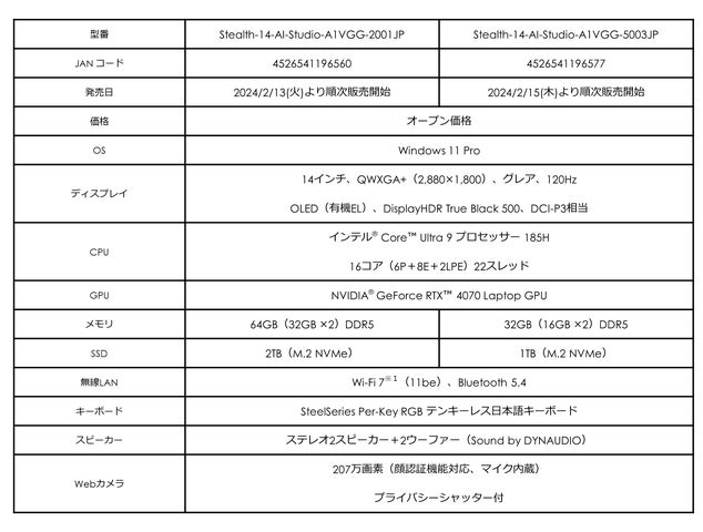 - AI機能を強化したCPUと高性能なGPUを搭載し、クリエイティブ作業にも最適な「Stealth 14 AI Studio A1V」