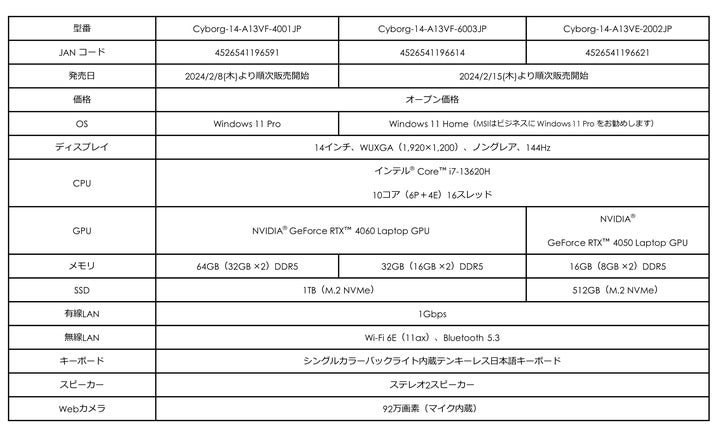 - 14インチの薄型軽量デザインで、フルHD解像度高フレームレートのゲームに最適な性能を持つ「Cyborg 14 A13V」