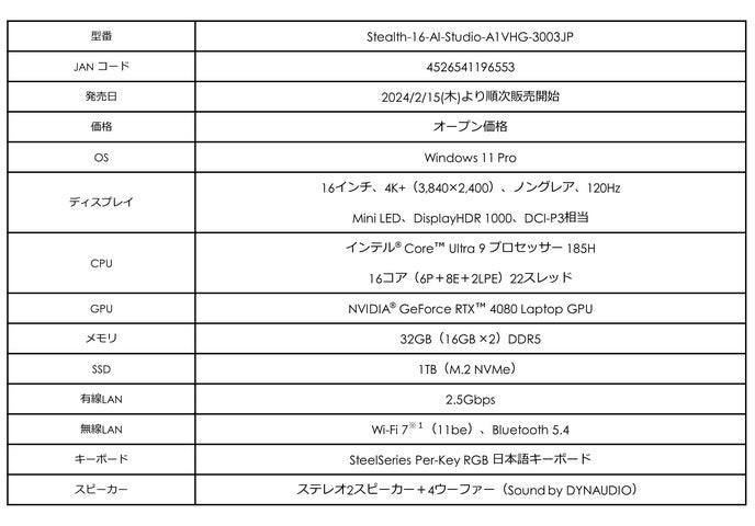 - 16インチの大画面タイプで、マグネシウム合金の材質を採用して薄型軽量化を実現した「Stealth 16 AI Studio A1V」