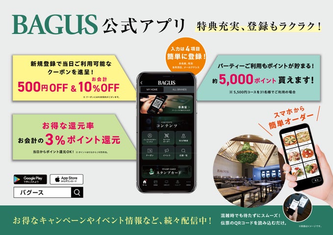 - BAGUS公式アプリでは、会員登録で実会計の3%がポイント還元されるほか、特典や最新情報が提供される