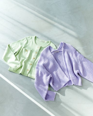 - Glitter、Knit、Spring Color、Jacquard、Printed Items、キラキラアイテム、ニットカーディガン、キレイ色のアイテム、ジャカード素材、花柄、チェック柄
