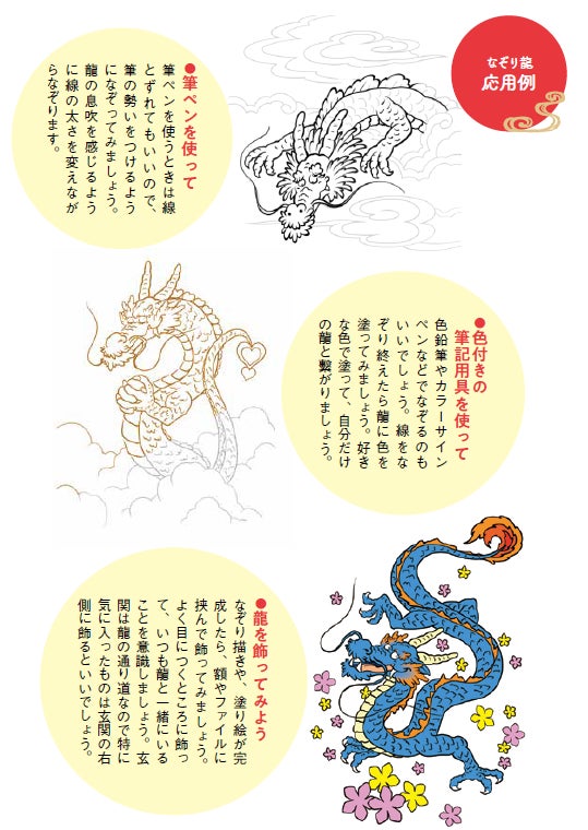 - 本書では、龍を選び、お願い事を書き、声に出して読み上げるという3つのステップでなぞり描きを行う。