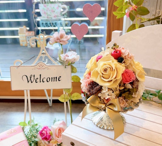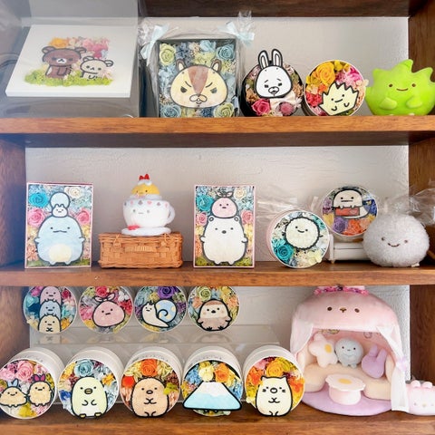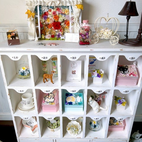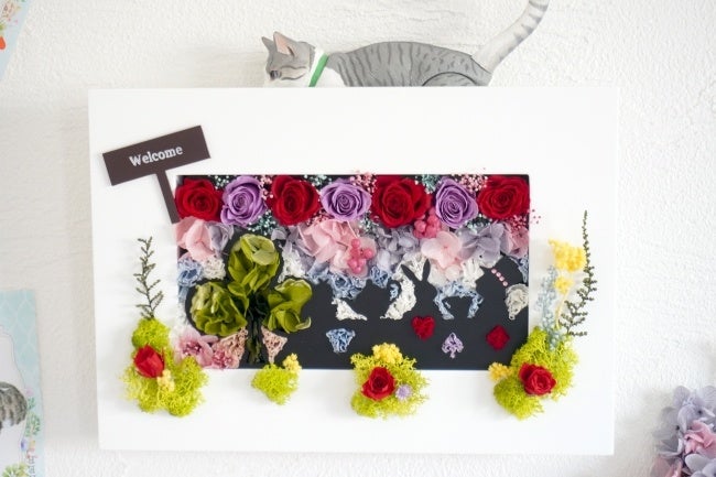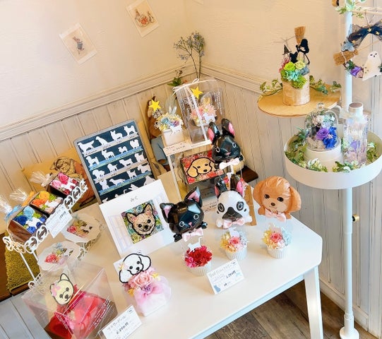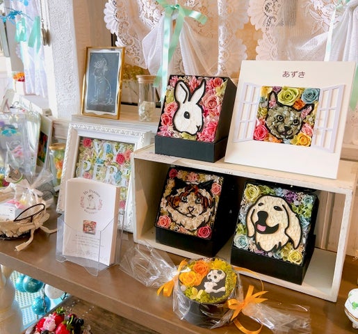 店内にはプリザーブドフラワーのアレンジメントが飾られ、ペットの似顔絵フラワーやアリスをテーマにしたアレンジメントも展示されています。