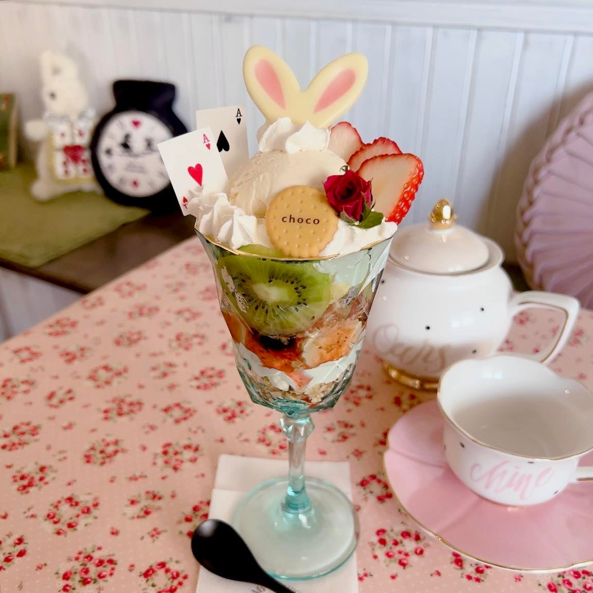 期間限定のスイーツには、「チシャ猫のいちごパフェ」や「白うさぎのフルーツパフェ」など、アリスの物語をイメージした4種類があります。