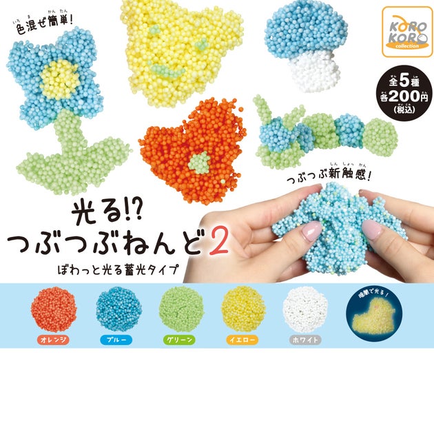 - つぶつぶとした触感が楽しい新感覚のねんどで、暗闇で光る蓄光仕様