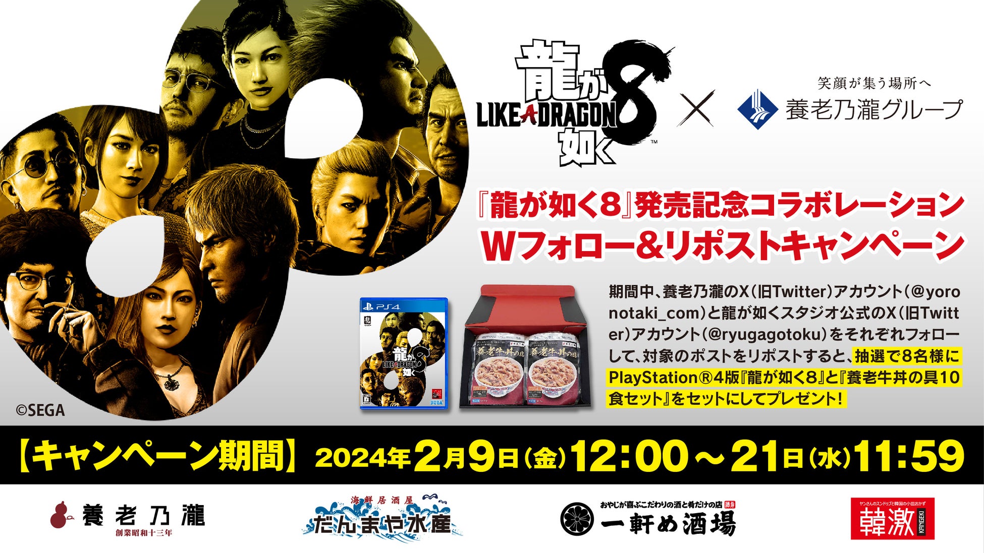 さらに、養老乃瀧のTwitterアカウントと龍が如くスタジオ公式のTwitterアカウントをフォローし、対象のポストをリポストすると、抽選でPlayStation®4版『龍が如く8』と『養老牛丼の具10食セット』がプレゼントされます。