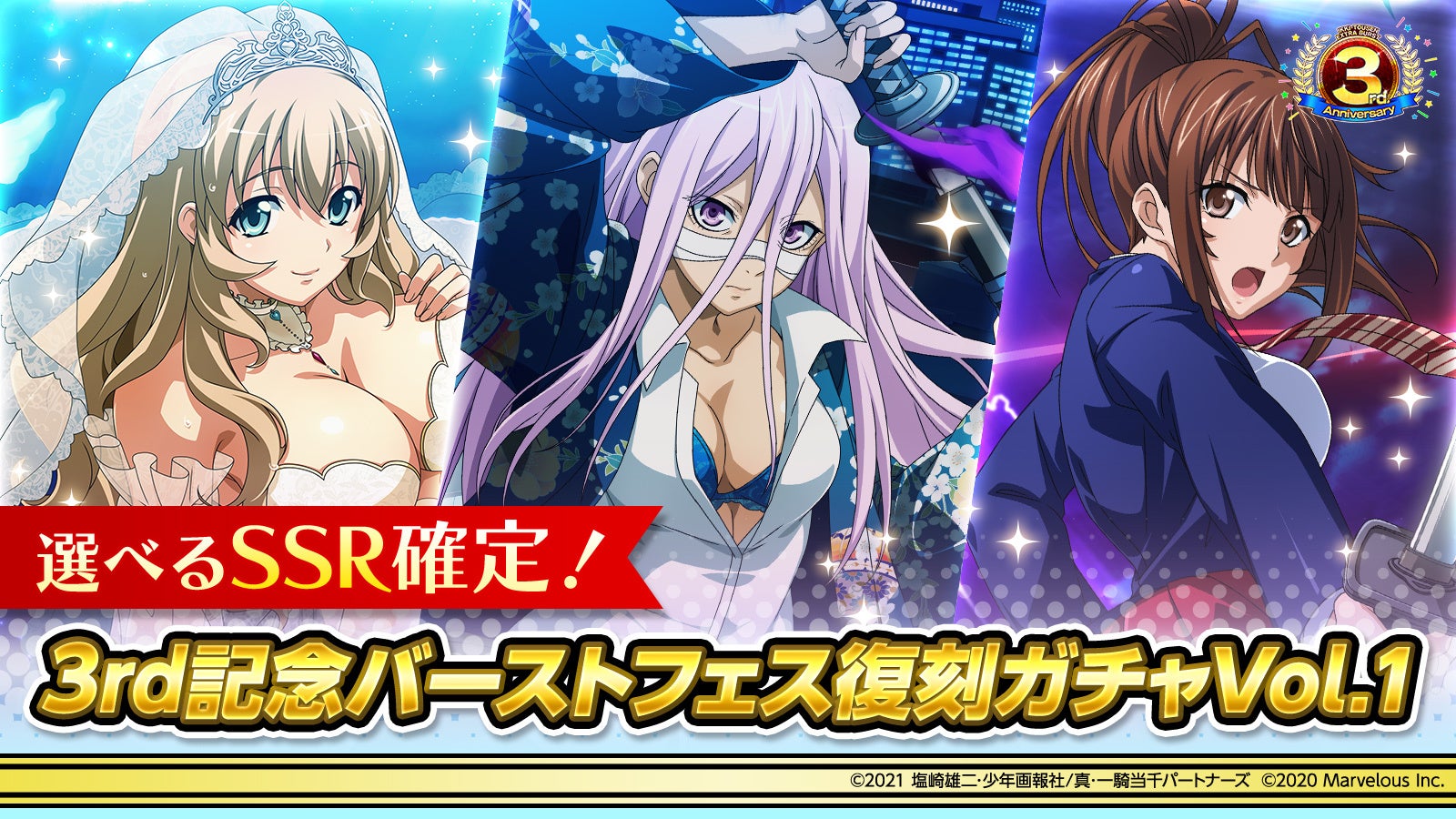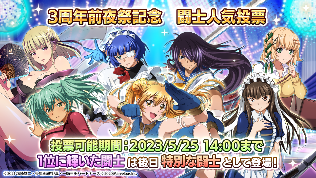 - サービス開始3周年、前夜祭イベント、記念ガチャ、ログインボーナス、夢見るステージクイーンガチャVol.1、バーストフェス限定闘士、人気投票イベント、公式ツイッター、プレゼントキャンペーン