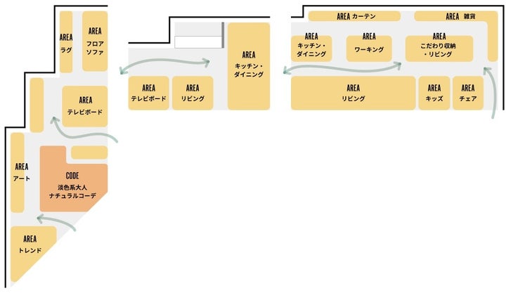 - トレンドエリア、こだわり収納・リビングエリア、フロアソファエリア、キッズエリア