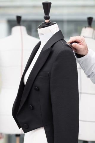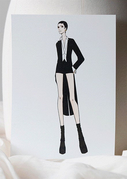 - カッティングのテールコートやグレーのスパンコールが使用されたシルエット