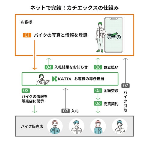 カチエックスはネット完結型のバイク売買サービスで、バイクの写真をアップロードするだけで複数の買取業者から査定を受けられます。