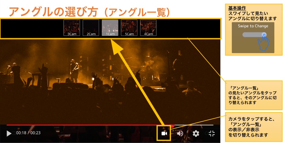 配信は最先端の映像配信技術であるSwipeVideo(スワイプビデオ)を使用しており、視聴者は自由にアングルを切り替えて視聴することができます。
