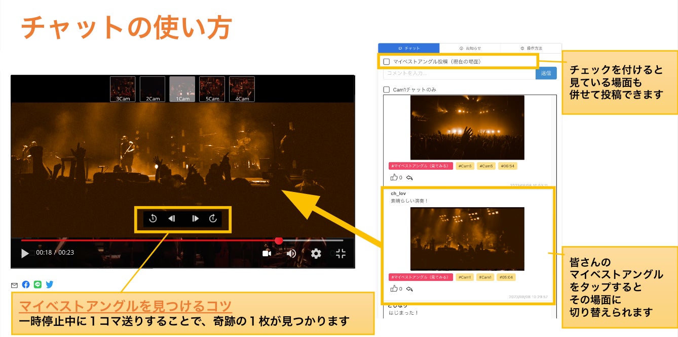 さらに、マイベストアングルチャット機能もあり、視聴者同士でシーンを共有することができます。