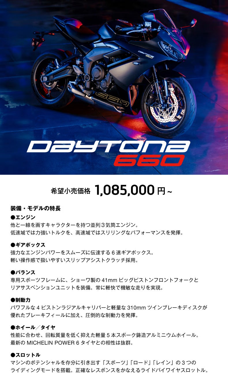 - 詳細はリンクを確認:https://www.triumphmotorcycles.jp/fortheride/news/brand/daytona20240209