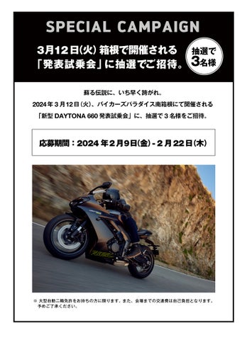 - キャンペーンに応募すると、Daytona 660の試乗機会を得られる
