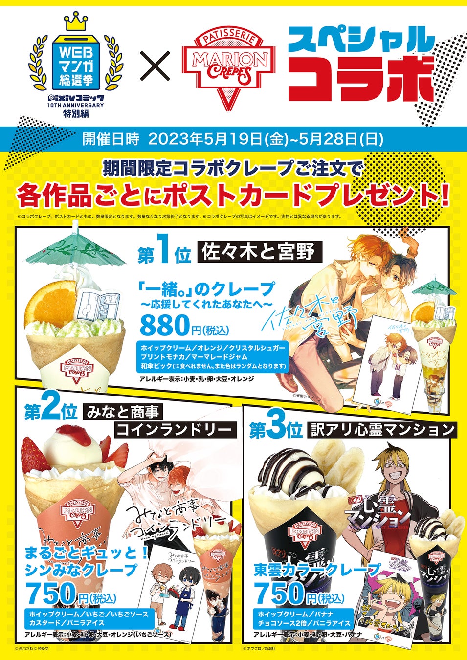 マリオンクレープの一部店舗にて、「WEBマンガ総選挙 pixivコミック10周年 特別編」1〜3位受賞作品をイメージした特別メニューを販売いたします。コラボクレープをご注文いただいた方に、各作品ごとのオリジナルポストカードをプレゼントいたします。