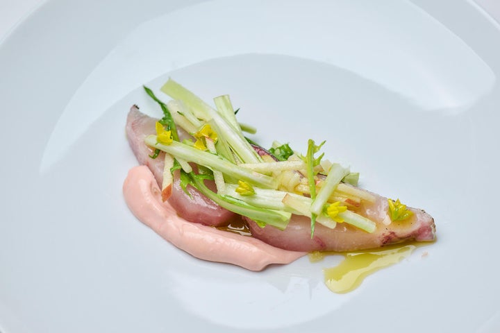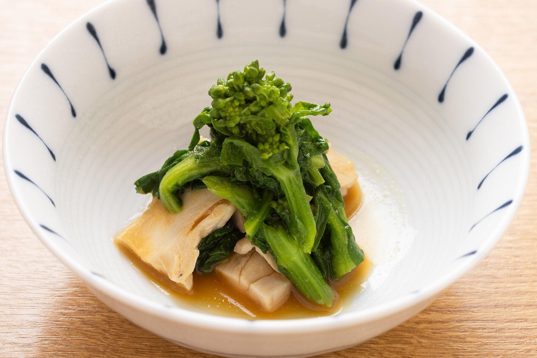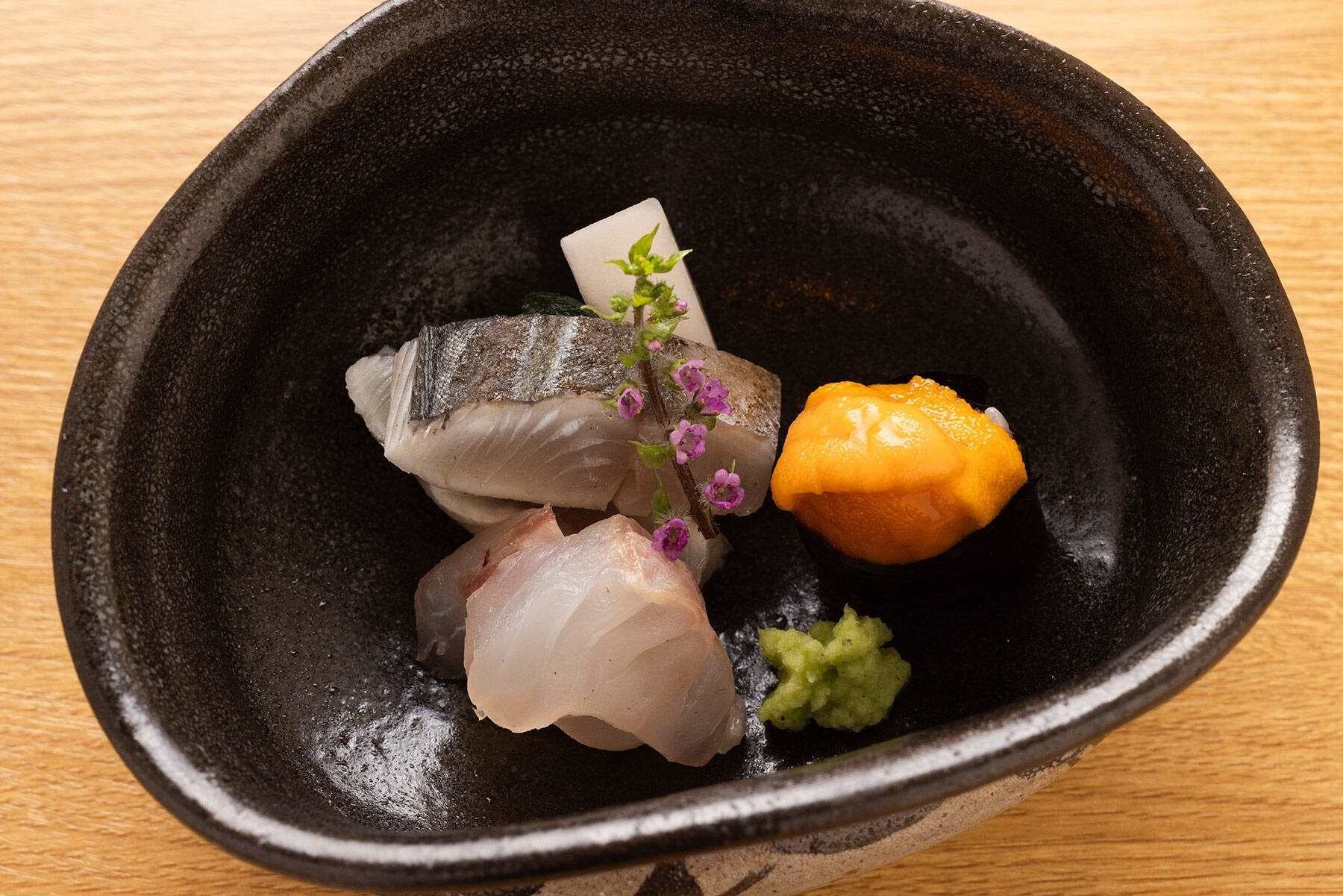 新宿割烹 中嶋では、福岡県産のサワラとクエを使用した生寿司や菜花とはかた地どりのサラダ風などが提供されます。