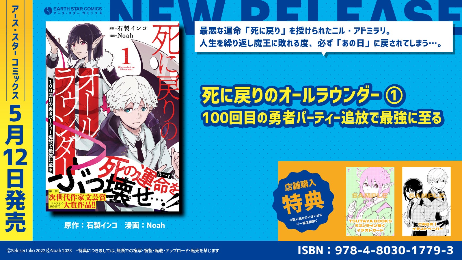 現在コミック アース・スターで掲載中の人気作品『死に戻りのオールラウンダー 100回目の勇者パーティー追放で最強に至る』(原作:石製インコ 漫画:Noah)第1巻を5月12日(金)に発売いたします。
