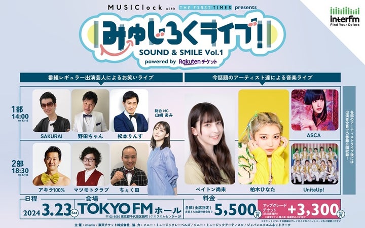 インターエフエムは、2024年3月23日に初のイベント「みゅじろくライブ!SOUND & SMILE Vol.1」を楽天チケットと共同開催することを発表しました。