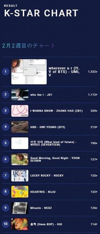 2月9日の放送回で、UMI,Vの「wherever u r (ft.V of BTS)」が再び1位を獲得しました。