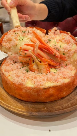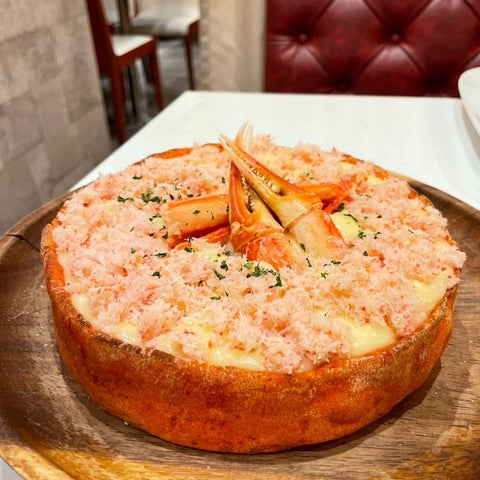 • チーズの上にはたくさんの蟹身が乗り、生地にはカニグラタンと特製トマトソースが敷き詰められている