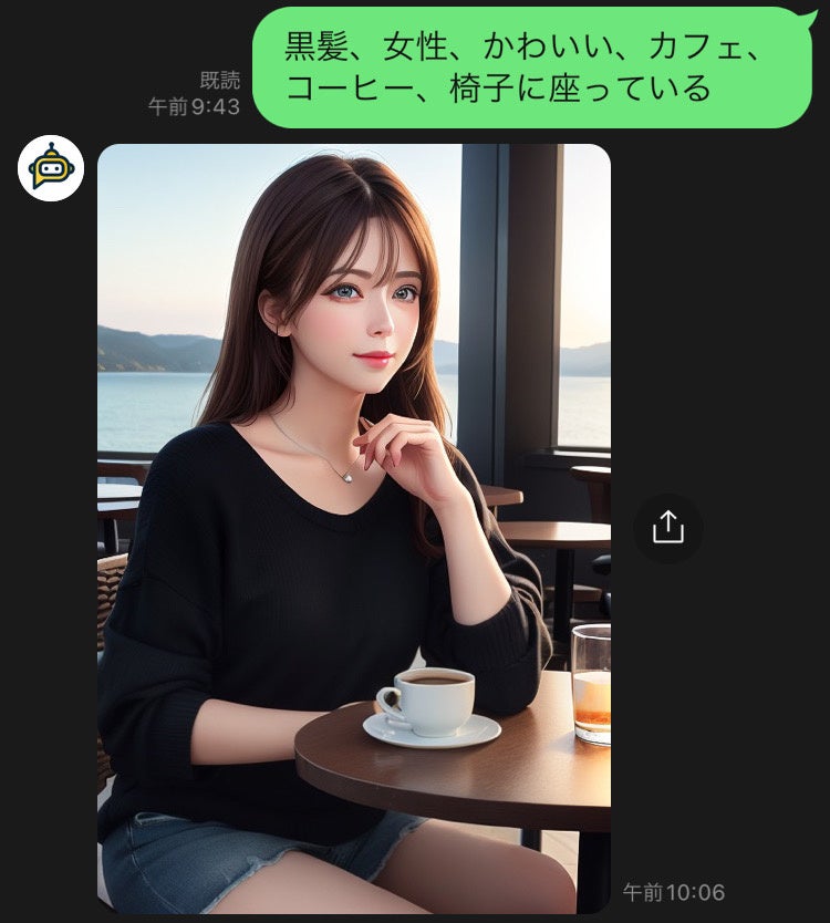 「黒髪、女性、可愛い、カフェ、コーヒー、椅子に座ってる」と送ってみると…