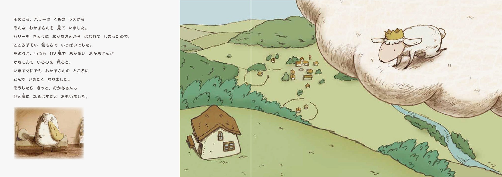 物語は、大切なこひつじを亡くしたお母さんと、雲の上から彼女を見守るハリーの心温まる交流を描いています。