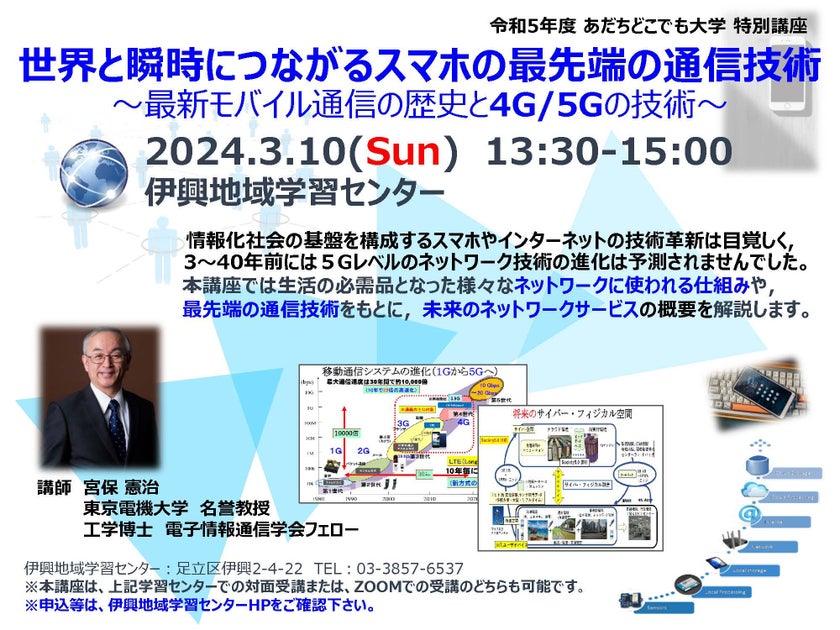 東京電機大学は、足立区伊興地域学習センターの主催で開催される地域連携イベント「世界と瞬時につながるスマホの最先端の通信技術~最新モバイル通信の歴史と4G/5Gの技術~」に協力します。