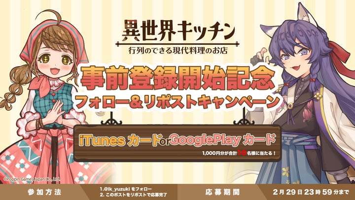 ポッピンゲームズジャパンは、Android/iOS向けの新作ゲーム『異世界キッチン 行列のできる現代料理のお店』の公式Xアカウントにて、iTunesカードまたはGooglePlayカードが当たるフォロー&リポストキャンペーンを開始しました。
