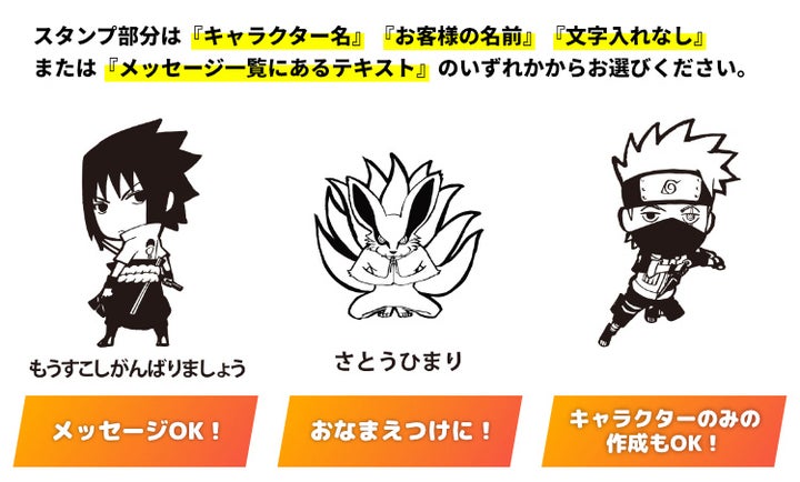 - ナルトやサスケなど5種類のデフォルメキャラクターが選べ、キャラクター名やメッセージも入れられる