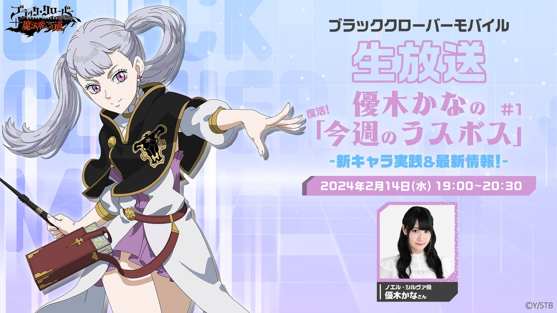 - 2月14日(水)19時より、『ブラッククローバーモバイル 魔法帝への道 The Opening of Fate』の公式番組『優木かなの「今週のラスボス」』が生放送されます。