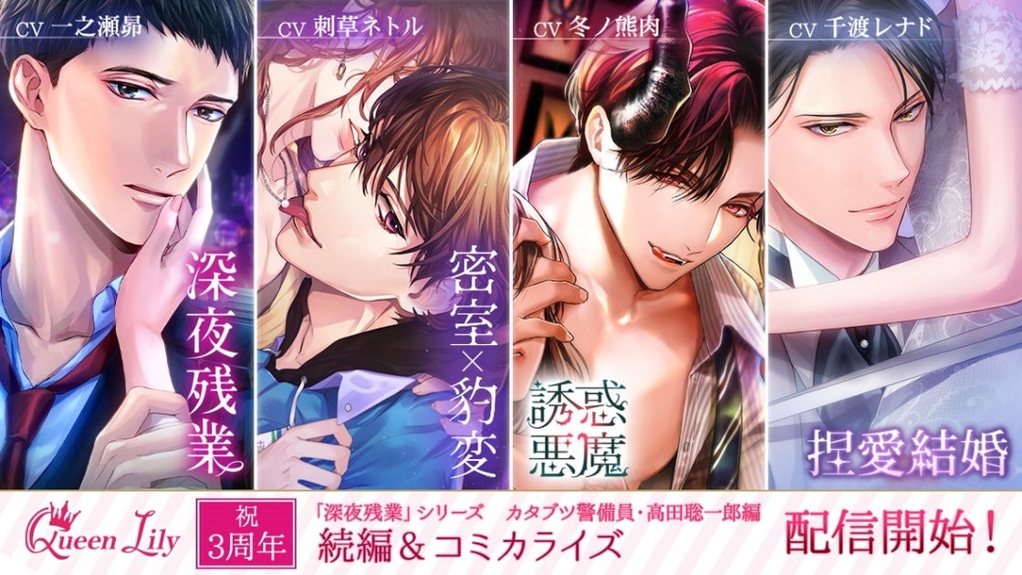 株式会社ボルテージは、シチュエーションドラマCDレーベル「Queen Lily」の創立3周年を祝っています。
