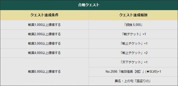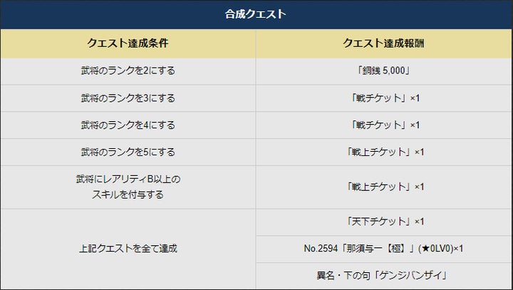 - 内政クエスト、合成クエスト、合戦クエストで武将カード入手可能