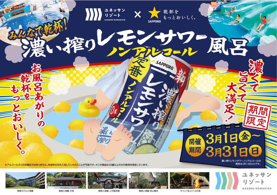 箱根小涌園ユネッサンでは、2024年3月1日からサッポロビールの新商品「サッポロ 濃い搾りレモンサワー ノンアルコール」とのコラボレーションイベントが開催されます。