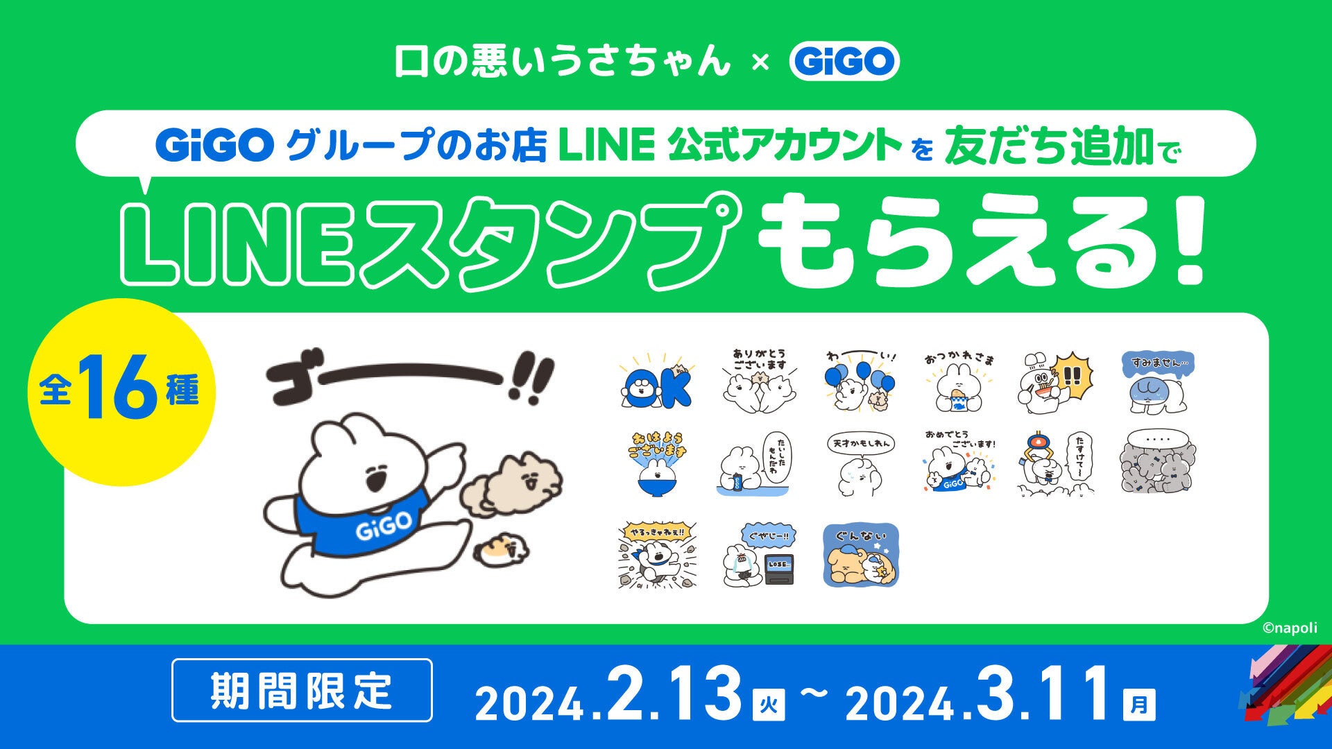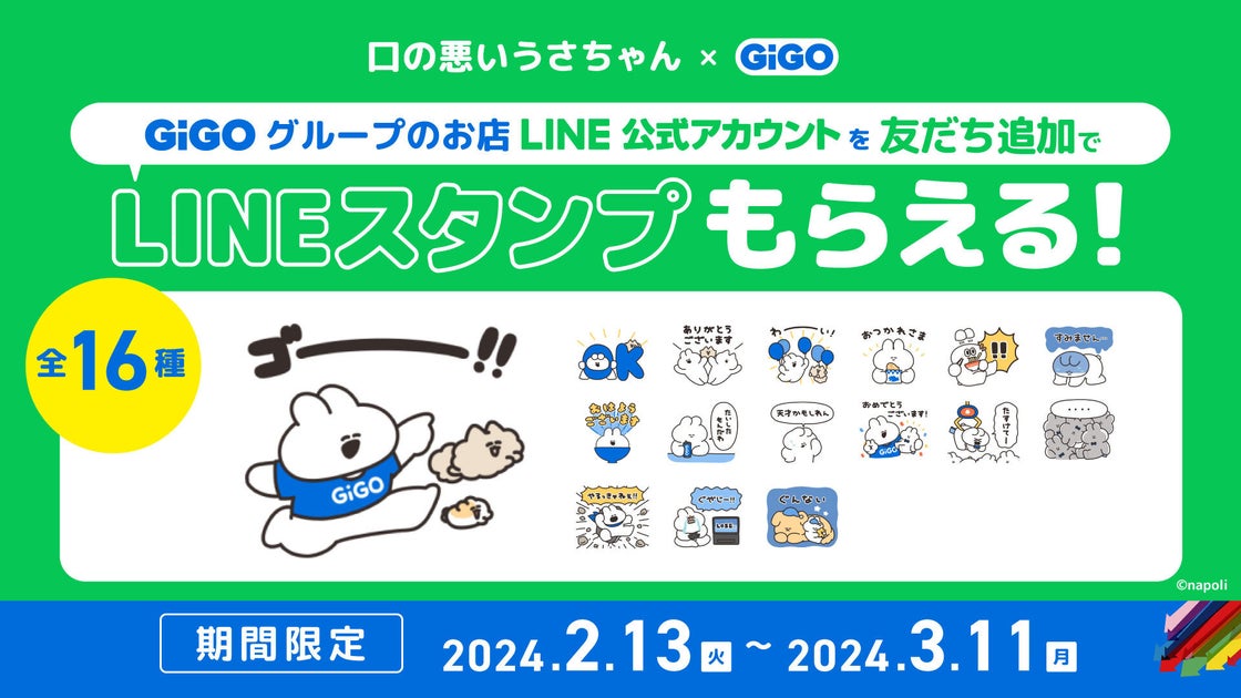 配布期間は2024年2月13日から3月11日までで、GiGOグループのお店のLINE公式アカウントを友だち追加することで無料でダウンロードできます。