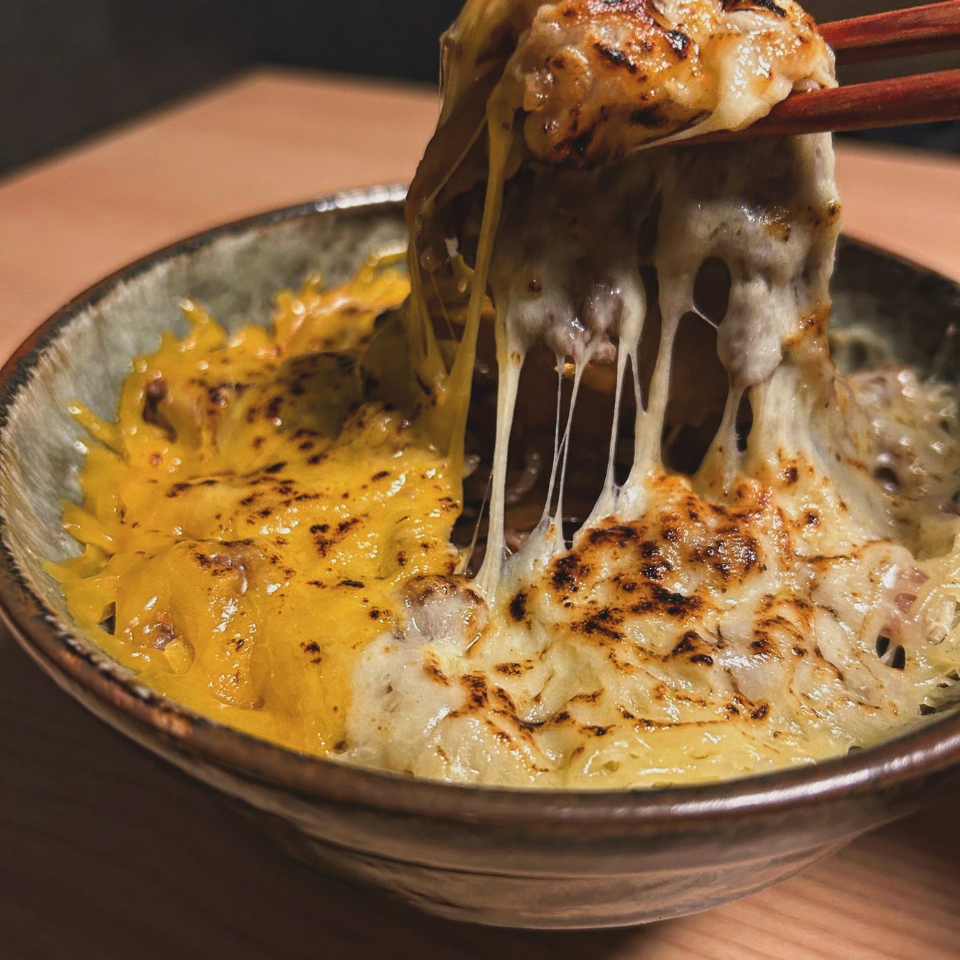 このメニューは、シュレッドチーズとチェダーチーズの2種類を牛丼の上に乗せて炙った逸品で、チーズの香ばしさと旨味、和牛の甘味と旨味が重なり合っています。