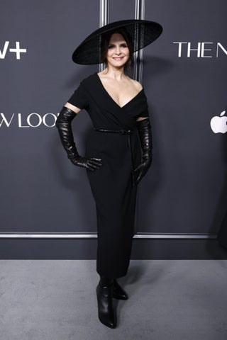 ジュリエット・ビノシュはブラックのウールのクレープドレスにハットやグローブ、ブーツを合わせてエレガントなスタイルを披露しました。