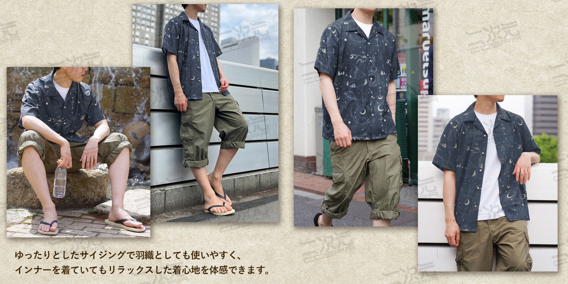 ・アロハシャツでありながらシーズンやシチュエーションを選ばないデザインは、普段使いからキャンプ、アウトドアなど様々なシーンに 対応し、パーカーやジャケットなどアウターと合わせれば3シーズン楽しめます。