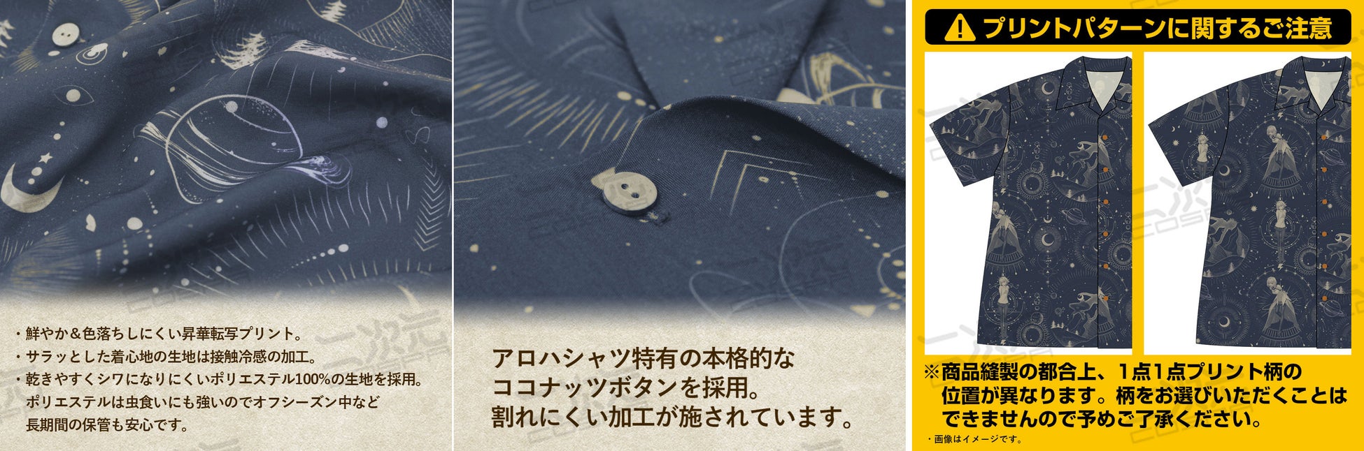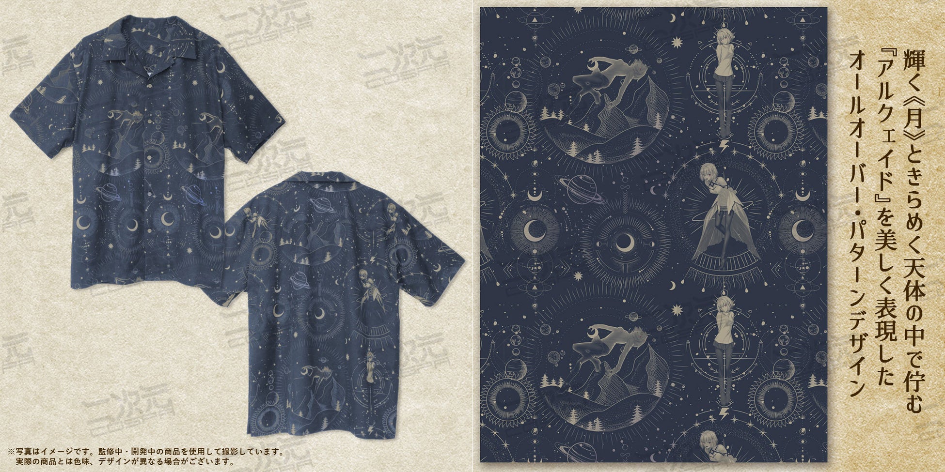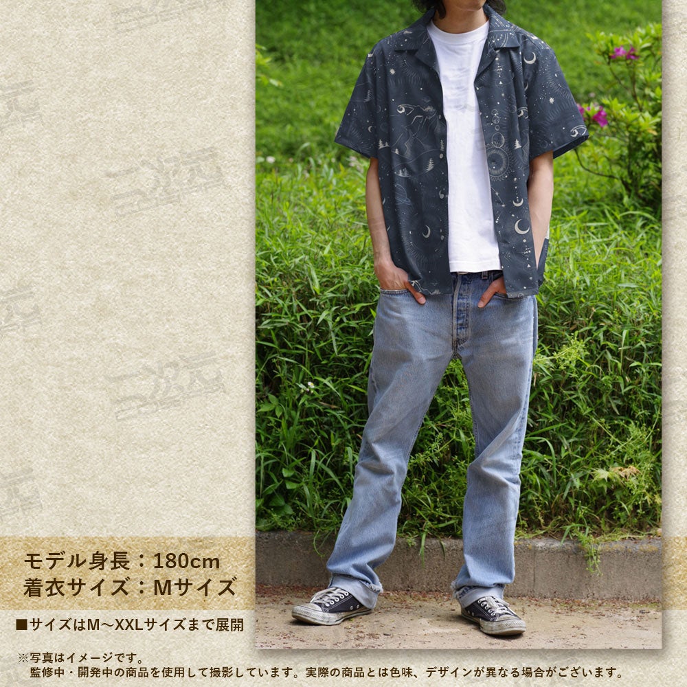 ・輝く“月”ときらめく天体の中で佇む『アルクェイド』を美しく表現したオールオーバー・パターンのアロハシャツ。