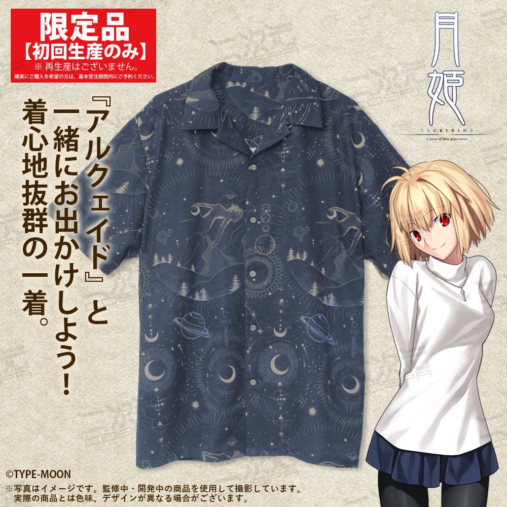 『月姫 -A piece of blue glass moon-』の限定グッズが登場!「真祖の姫」アルクェイドをデザインに取り入れたアロハシャツで、初回生産限定品となっている。