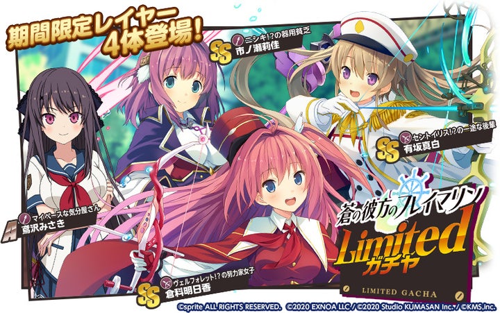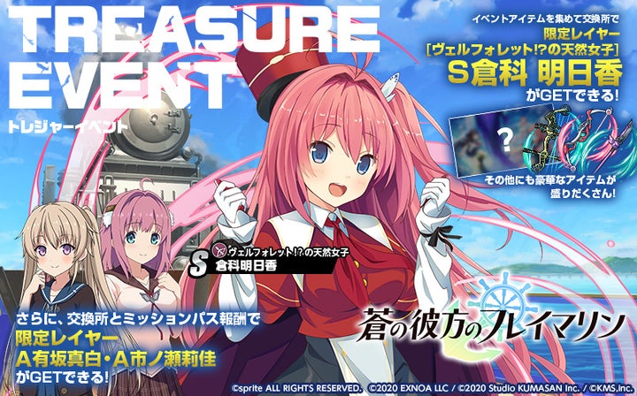 - トレジャーイベント「蒼の彼方のフレイマリン」も開催され、イベントクエストで交換アイテムを集めることでS倉科明日香、A市ノ瀬莉佳、A有坂真白のレイヤー、限定装備、ガチャ切符を獲得できる
