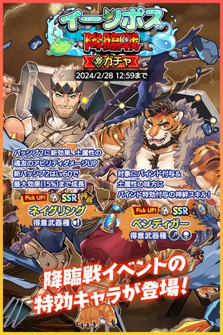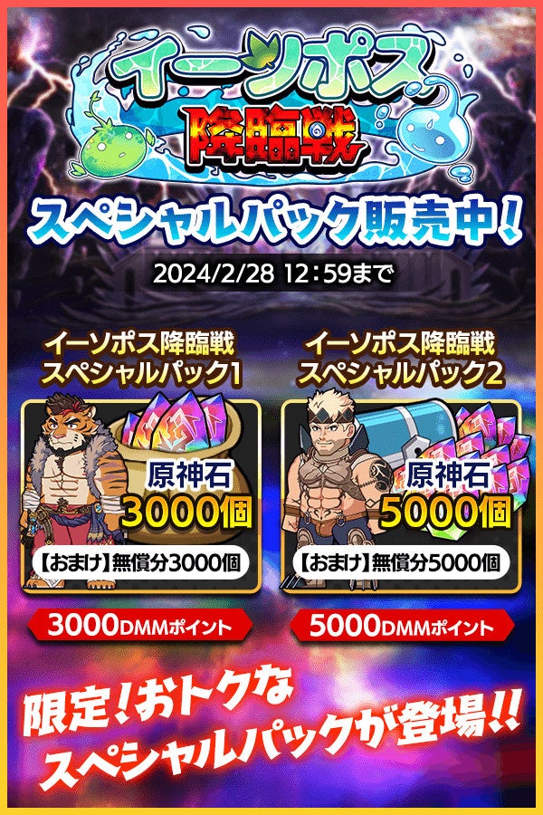 イベント特効キャラクターを編成すると、アイテムのドロップ率が上がるので、積極的に挑戦しましょう!さらに、期間限定のパックも登場しますので、お見逃しなく!開催期間は2月13日(火)メンテナンス後から2月28日(水)12:59までです。